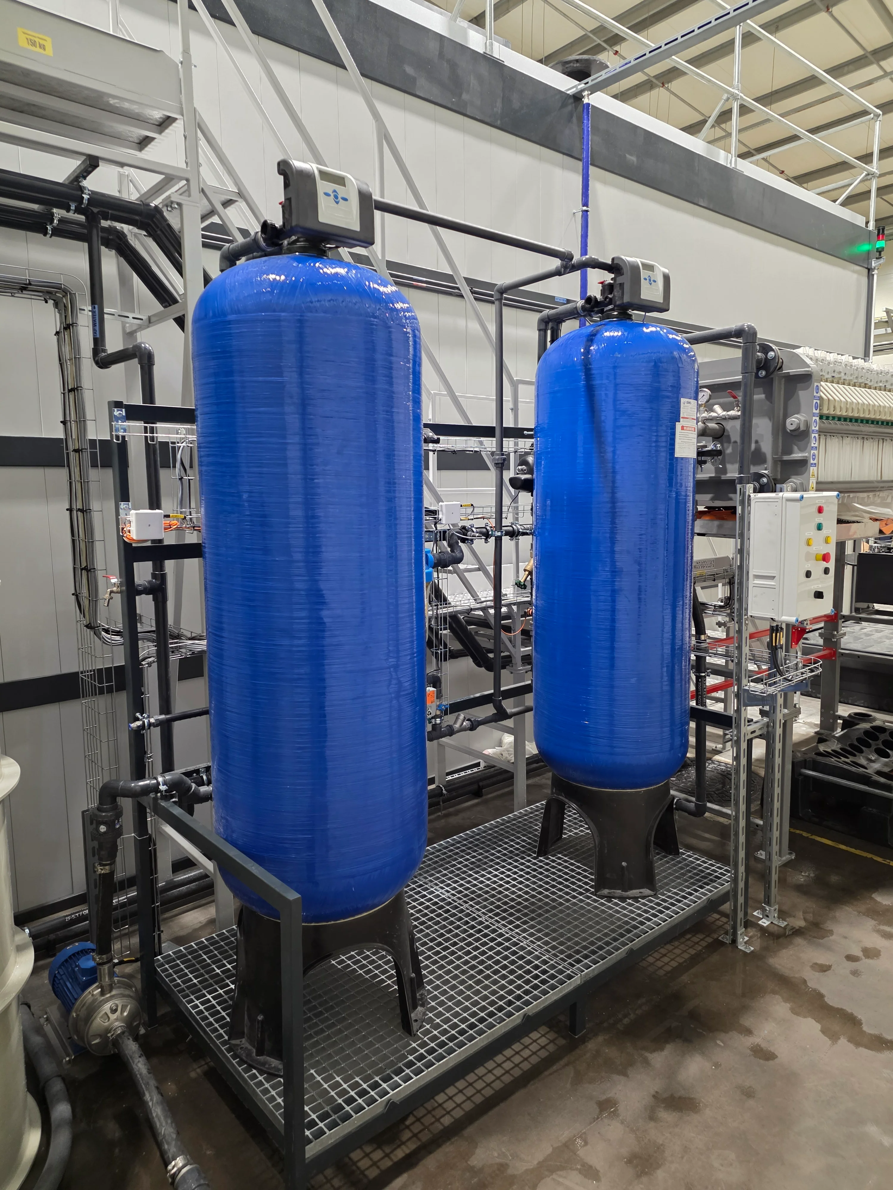 Układ filtracji ścieków przemysłowych po procesie neutralizacji. Mobilna konstrukcja na ramie. Pomiar statusu filtrów, ciśnienia oraz przepływu. System zarządzany przez nadrzędny system SCADA.