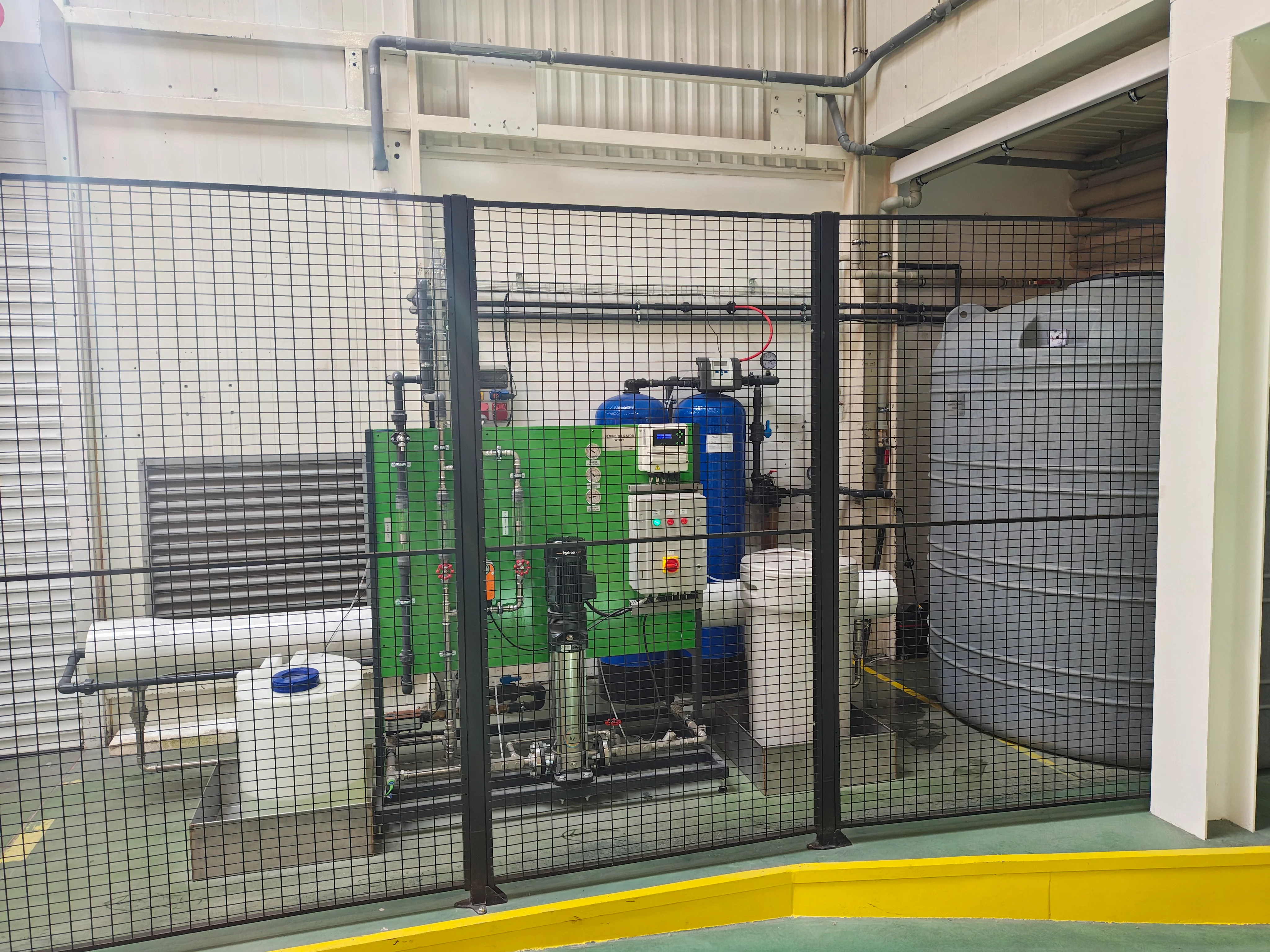 Zasilanie linii lakierniczej wodą demineralizowaną. Wydajność układu ok. 3 m3/h. Kompletny system wraz z prefiltracją oraz magazynowaniem i dystrybucją wody demineralizowanej.